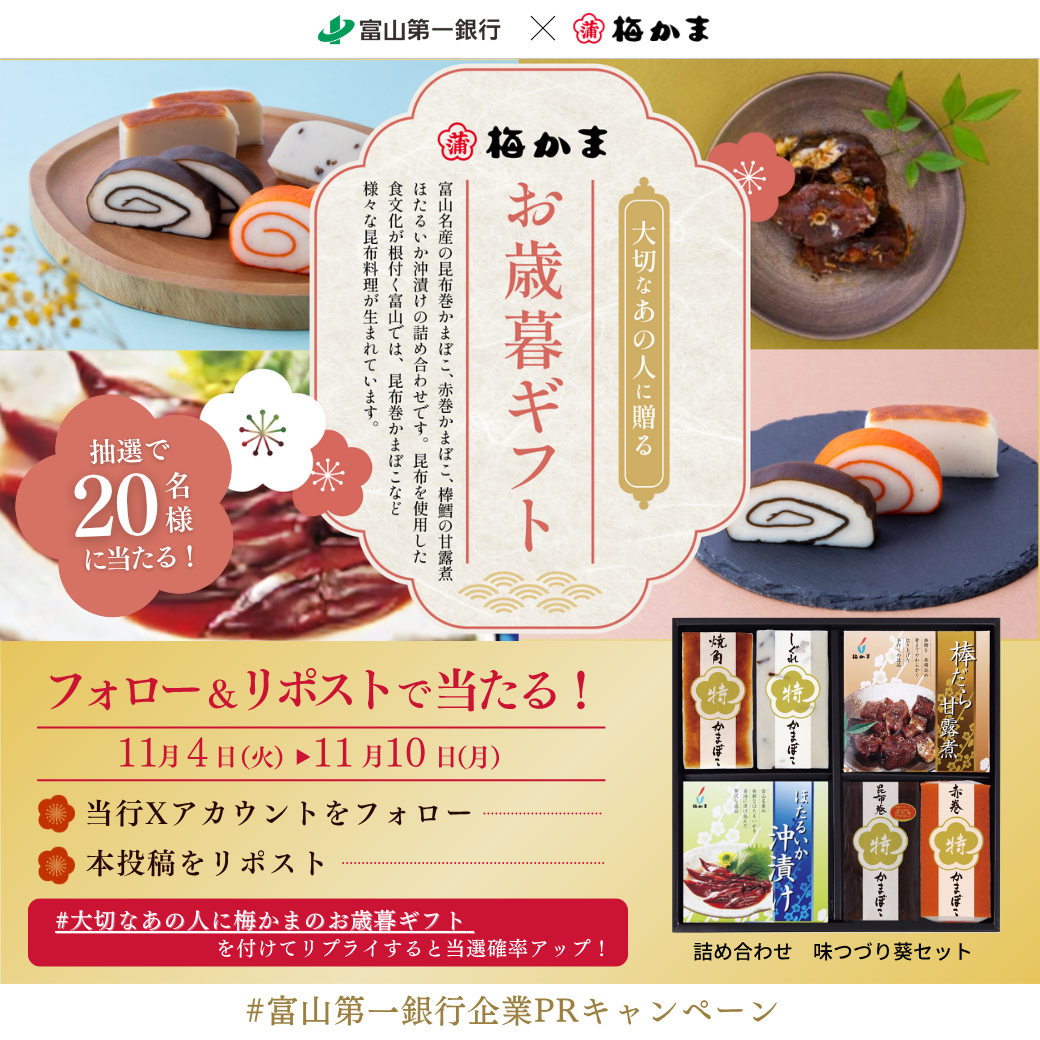 当行では株式会社梅かま様タイアップによる「詰め合わせ(味つづり 葵セット)」をプレゼントするキャンペーンを富山第一銀行公式Xアカウント上で実施いたします。