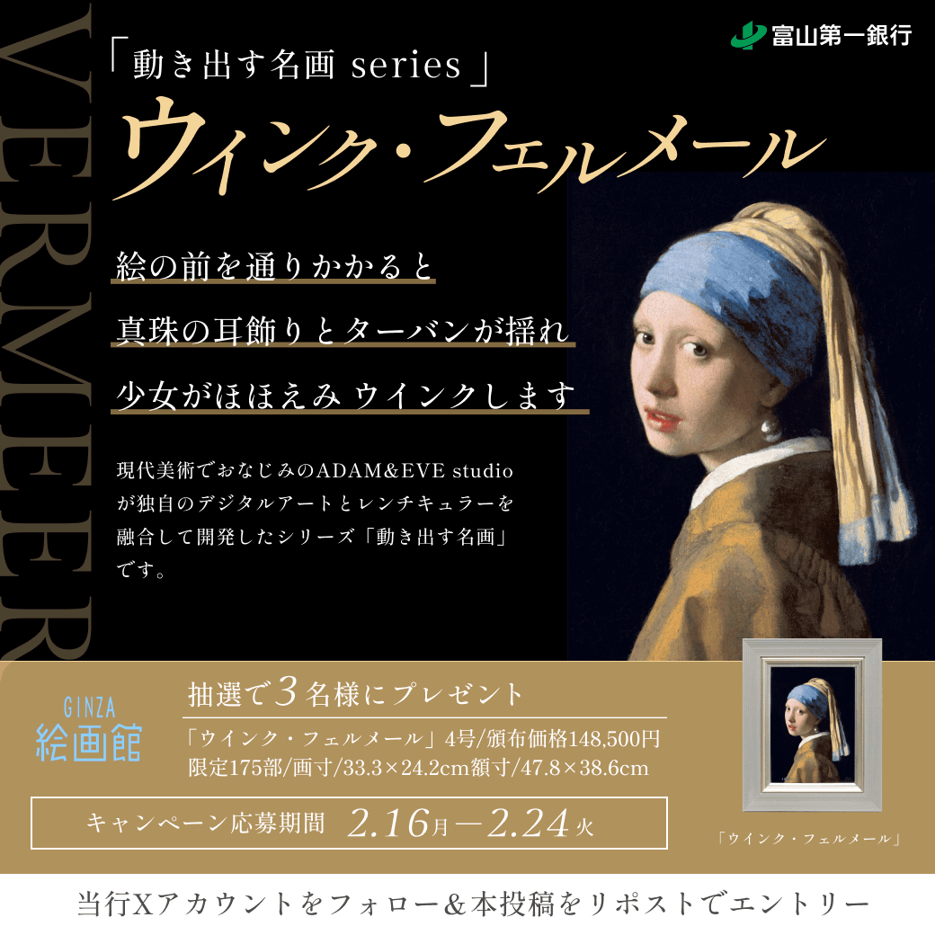 当行ではGINZA絵画館様タイアップによる動き出す名画シリーズのひとつである「ウインク・フェルメール」をプレゼントするキャンペーンを富山第一銀行公式Xアカウント上で実施いたします。