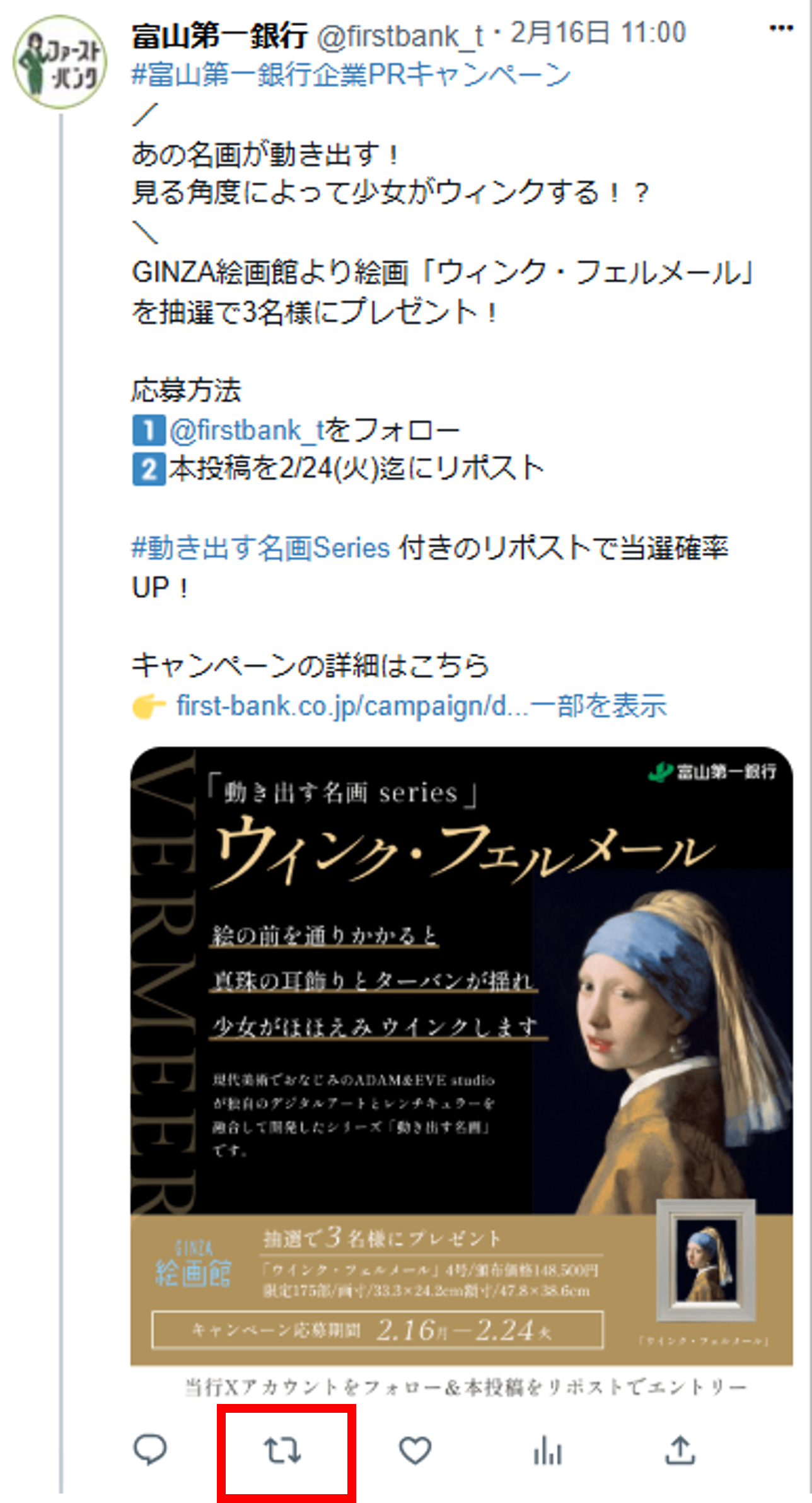 当行公式Xアカウント「名画がウインク?現代美術の驚きをあなたに!フェルメールの魅力を感じてみよう」フォロー&リポストキャンペーン実施について