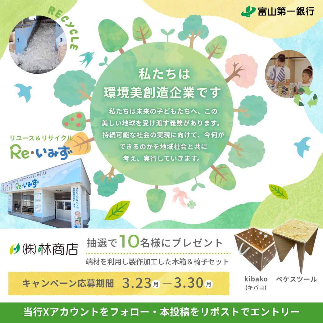 当行では、林商店様タイアップによる「木箱&椅子セット」をプレゼントするキャンペーンを富山第一銀行公式Xアカウント上で実施いたします。