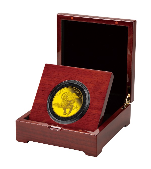 【表面】 オーストラリア発行の硬貨に共通の女王エリザベス2世の肖像が描かれています。2019年から採用されている6番目のデザインは、アーティストのジョディ・クラーク氏によるもので、穏やかな微笑をたたえた表情が特徴的です。コインの重量や純度、額面なども刻まれています。 【裏面】 岩山の上に立ち、牙をむきながら吠える虎の猛々しい姿を大きく描いたシンプルなデザイン。虎のシンボルとも言えるシマ模様や毛並み、岩肌などが緻密な刻印技術でリアルに表現されています。漢字の「虎」や「TIGER2022」 、パース造幣局で鋳造されたことを示すミントマーク「P」も刻印されています。 |