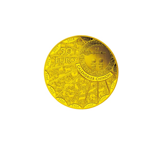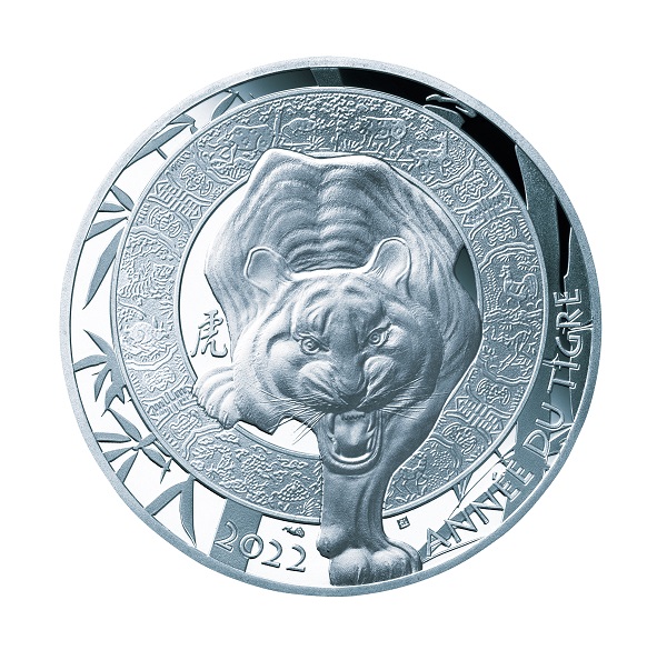 【表面】 正面から見た虎が雄叫びをあげながら輪の中から身を乗り出している、フランス国立造幣局らしい独創的なデザイン。輪の中には十二支の動物や植物のモチーフ、周囲には竹林が微細な彫刻で描かれています。中国の書道家・趙長青氏による「虎」の文字や仏語「ANNÉE DU TIGRE」と刻まれています。 【裏面】 中国の伝統的な寺院の扉が右上に円形で描かれ、それを扇状に取り囲むように十二支の動物たちが精緻な彫刻技術でランダムかつ重層的に描かれています。周りには年号(2018年~2029年)や、フランス語で「CALENDRIER CHINOIS」(中国暦)と刻まれています。 |